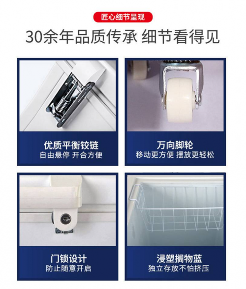 細節設計彰顯專業品質。冷柜采用合金內膽材質,拼接處無連接條,不僅平整美觀,更具備超強耐腐蝕性能,可抵御鹽水浸漬,不易生銹滋生細菌,日常清理簡單便捷。人性化設計貫穿產品全程:整體注塑柜口工藝打造細膩手感,無拼接痕跡;安全門鎖防止食材隨意取用,萬向腳輪便于靈活移動,平衡鉸鏈支持柜門自由懸停,開合省力,全方位適配商戶日常運營需求。