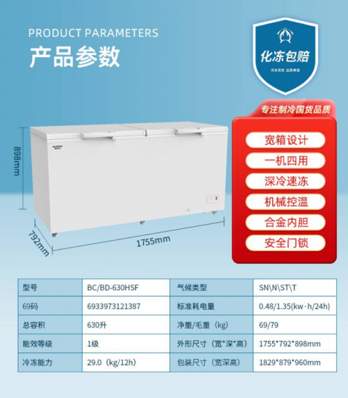 作為針對大生意場景的旗艦產品,澳柯瑪BC/BD-630HSF以寬體設計重新定義存儲邊界。其外形尺寸達到1755*792*898毫米的黃金比例,超寬箱體打破傳統冷柜存儲限制,無論是整箱海鮮、大塊肉食,還是整張貂皮等特殊物品,都能實現隨心擺放。大容量設計搭配均勻制冷系統,確保食材凍得透、存得多,徹底解決商戶旺季存儲壓力,滿足批量備貨需求。