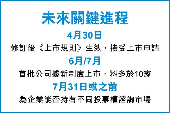 港交所(00388)發(fā)表創(chuàng)新產(chǎn)業(yè)公司上市制度咨詢總結(jié),下周一(30日)正式接受同股不同權(quán)新經(jīng)濟公司、未有收入的生物科技公司申請。行政總裁李小加預(yù)期,很快有不下于10家按新例提交上市申請,首批可于6月或7月上市。